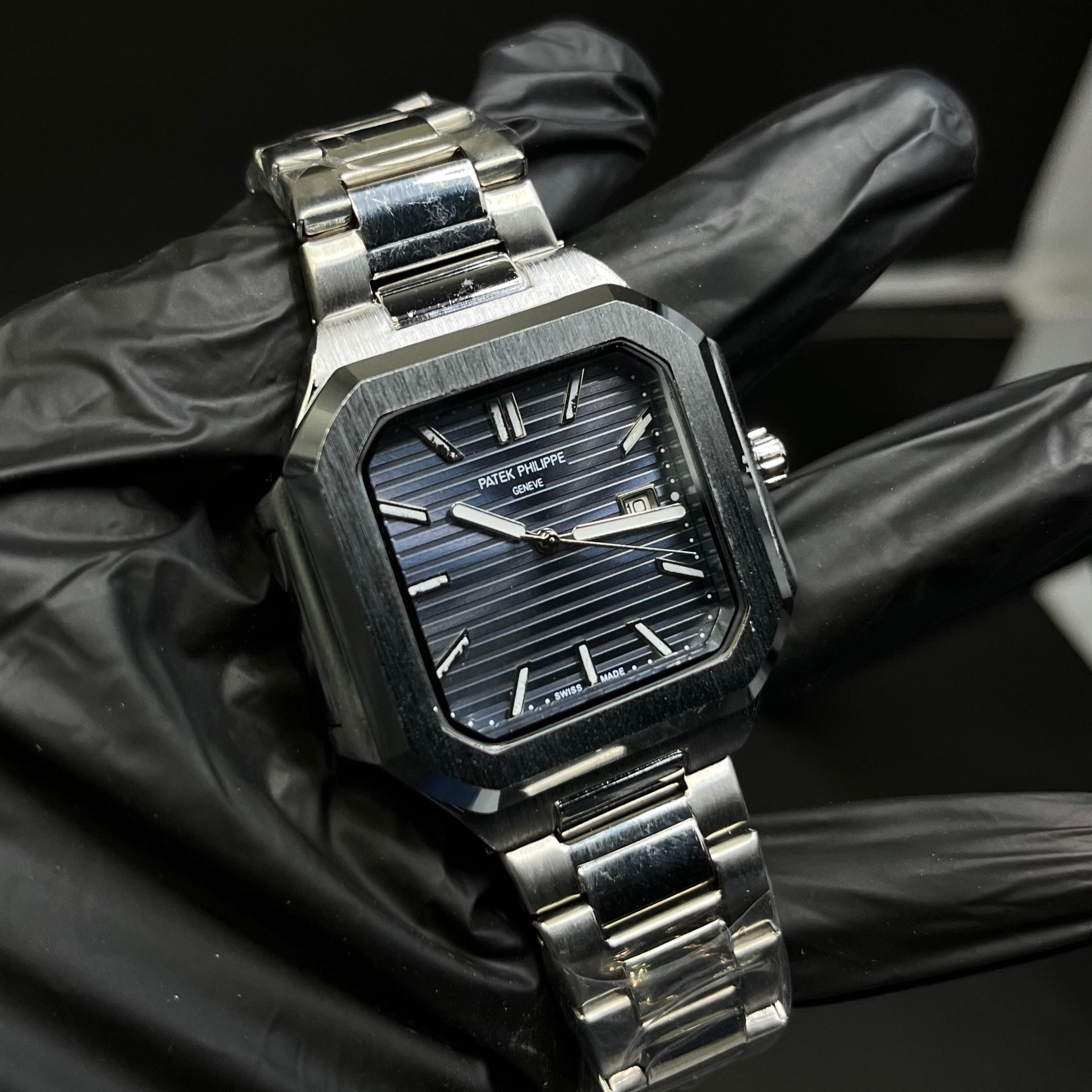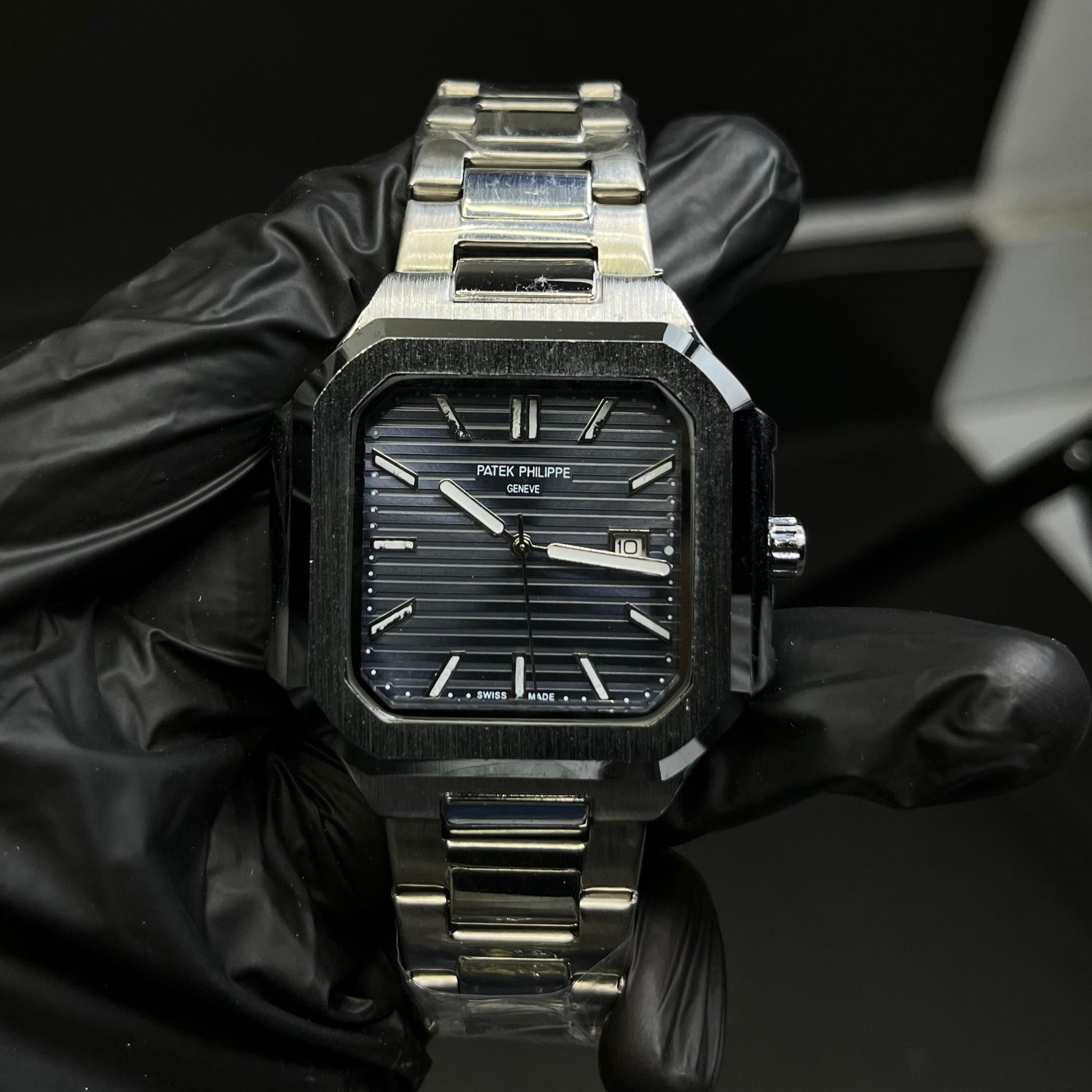 Elevate your style with this premium Patek Philippe Big Dial Watch, crafted with precision and elegance. Featuring a bold rectangular case design, this timepiece stands out with its black textured dial and polished stainless steel bracelet.